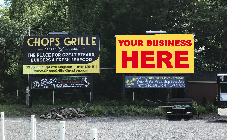 Lighted 20' by 10' Billboard available for rent, short or long term at busy City of Kingston intersection. Advertise your law firm, plumbing business, landscaping company, restaurant, store, real estate company, church, oil company, your upcoming event, election or anything you can think of. 1000's of cars pass by every day, most of them are stopped either at the light on Greenkill Ave. or at Wilbur Ave. Previous advertisers have given it raving reviews and all say they will advertise again in the future. Rental terms are negotiable and flexible for the right advertisers. We will help you design your ad for maximum effectiveness, so that you look your best and make the most impact for your advertising dollars. Billboard is in route to the center of the city of Kingston at Broadway, many residential and commercial areas surrounding. Billboard is seen by people traveling to uptown and downtown Kingston, as well as passing by to goto the Town of Ulster major shopping district. People traveling into Kingston from the south, Rosendale, New Paltz, Tillson areas traveling into Kingston via Rt 32 north pass by. People traveling into Kingston from Rt 213 - Esopus, Port Ewen, St. Remy and others all pass by. Great visibility due to road and billboard elevations.